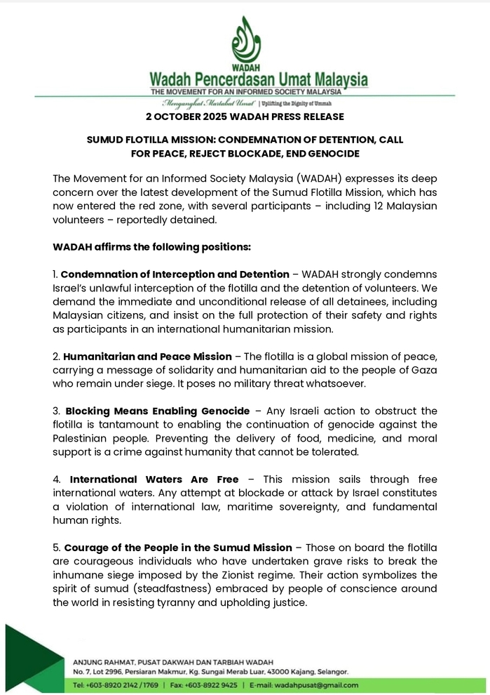 The Movement for an Informed Society Malaysia (WADAH) expresses its deep concern over the latest development of the Sumud Flotilla Mission, which has now entered the red zone, with several participants – including 12 Malaysian volunteers – reportedly detained.