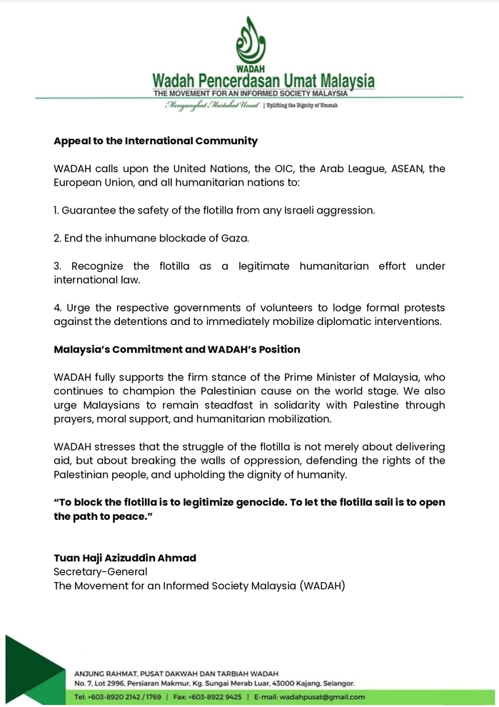 Condemnation of Interception and Detention – WADAH strongly condemns Israel’s unlawful interception of the flotilla and the detention of volunteers. We demand the immediate and unconditional release of all detainees, including Malaysian citizens, and insist on the full protection of their safety and rights as participants in an international humanitarian mission.