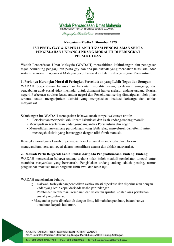 WADAH berpendirian bahawa isu berkaitan moraliti awam, perlakuan songsang, dan pencabulan adab sosial tidak memadai untuk ditangani hanya melalui undang-undang Syariah negeri. Perbezaan struktur kuasa antara negeri dan Persekutuan sering dimanipulasi oleh pihak tertentu untuk menganjurkan aktiviti yang menjejaskan institusi keluarga dan akhlak masyarakat.