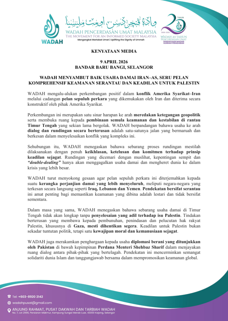WADAH mengalu-alukan perkembangan positif dalam konflik Amerika Syarikat–Iran melalui cadangan pelan sepuluh perkara yang dikemukakan oleh Iran dan diterima secara konstruktif oleh pihak Amerika Syarikat.
