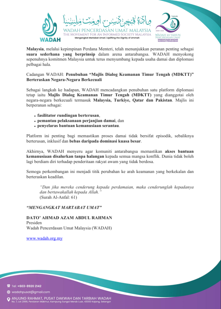 Dalam masa yang sama, WADAH menegaskan bahawa sebarang usaha damai di Timur Tengah tidak akan lengkap tanpa penyelesaian yang adil terhadap isu Palestin. Tindakan berterusan yang membawa kepada pembunuhan, penindasan dan pelucutan hak rakyat Palestin, khususnya di Gaza, mesti dihentikan segera. Keadilan untuk Palestin bukan sekadar tuntutan politik, tetapi satu kewajipan moral dan kemanusiaan sejagat.