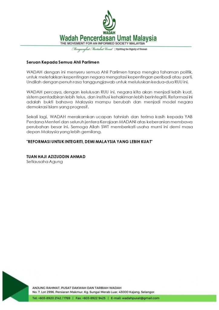 WADAH percaya, dengan kelulusan RUU ini, negara kita akan menjadi lebih kuat, sistem pentadbiran lebih telus, dan institusi kehakiman lebih berintegriti. Reformasi ini adalah bukti bahawa Malaysia mampu berubah dan menjadi model negara demokrasi Islam yang progresif.